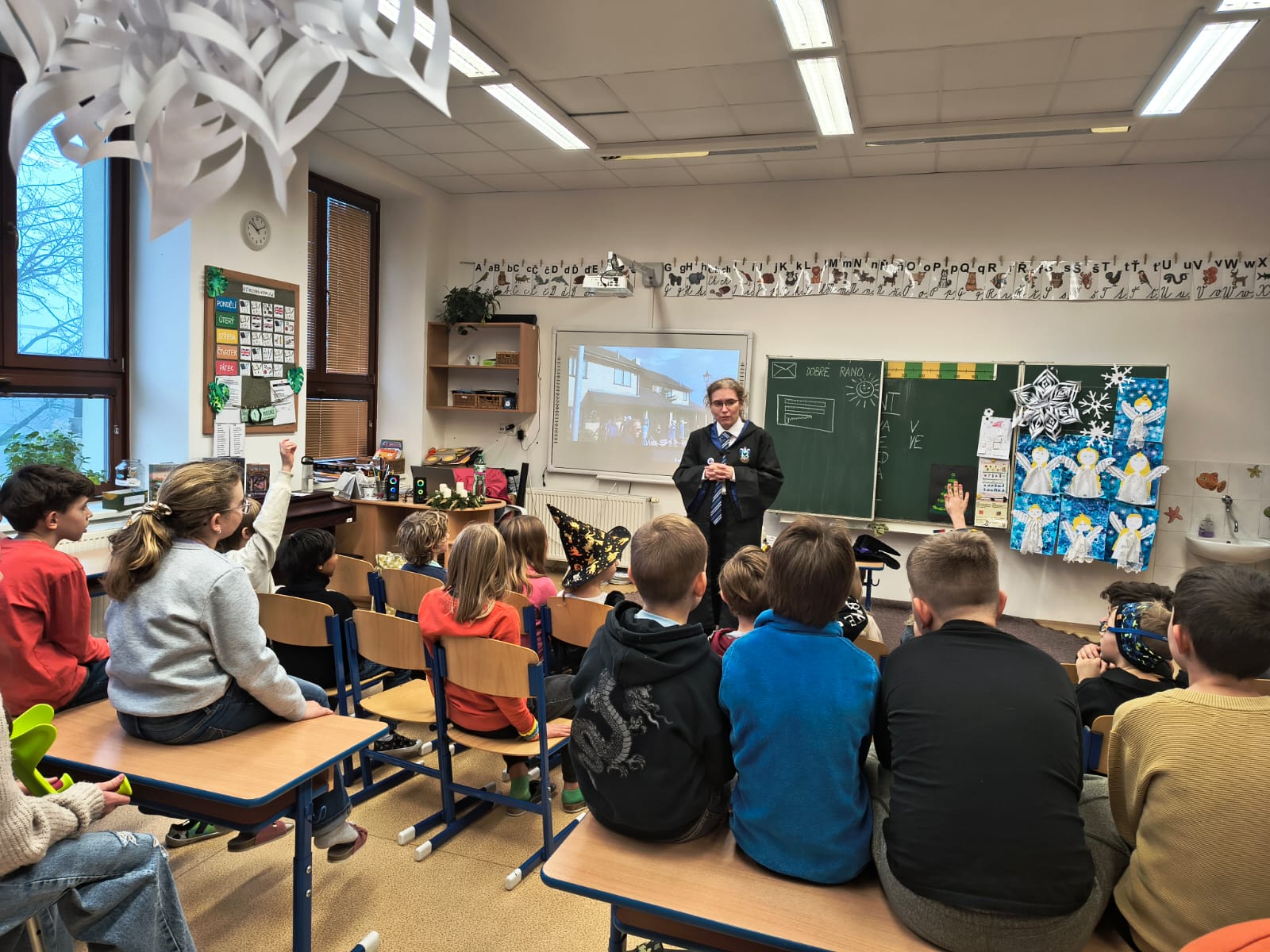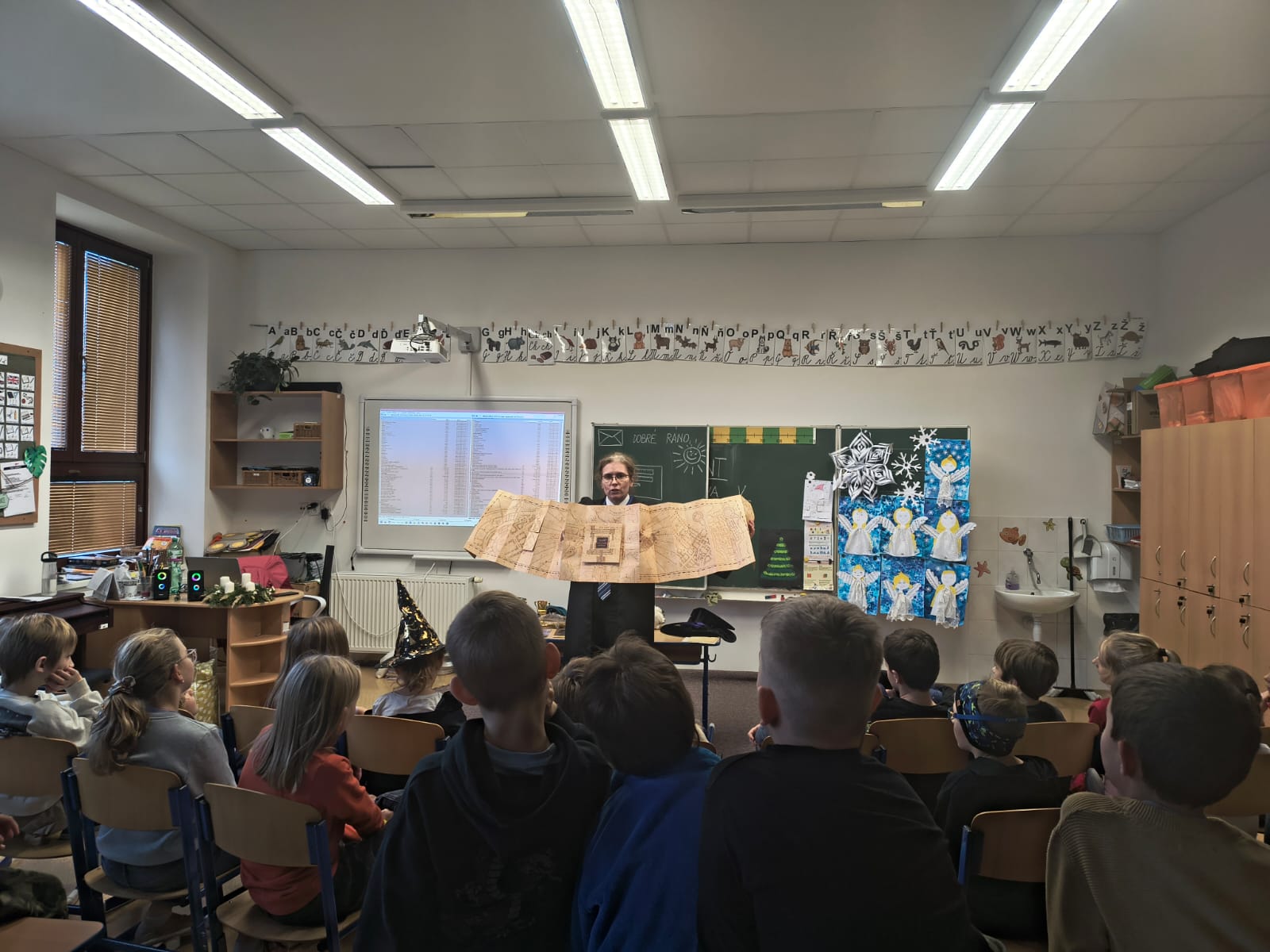 Přednáška se setkala u dětí s velkým zájmem, stejně jako možnost prohlédnout si kouzelnické hůlky, sovu Hedviku a další artefakty z oblíbeného příbehu o Harry Potterovi.